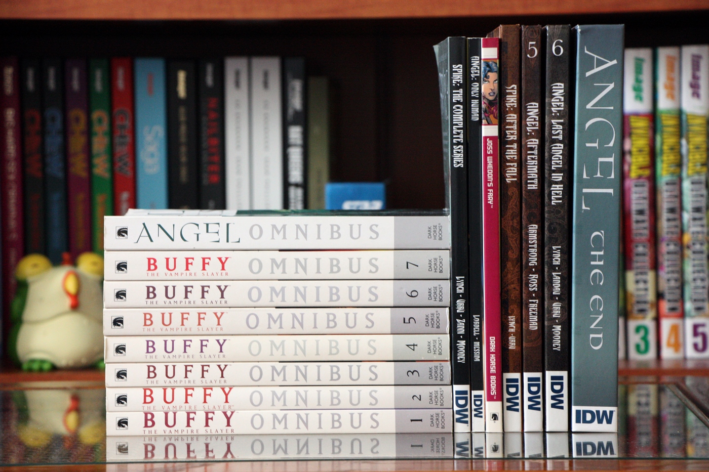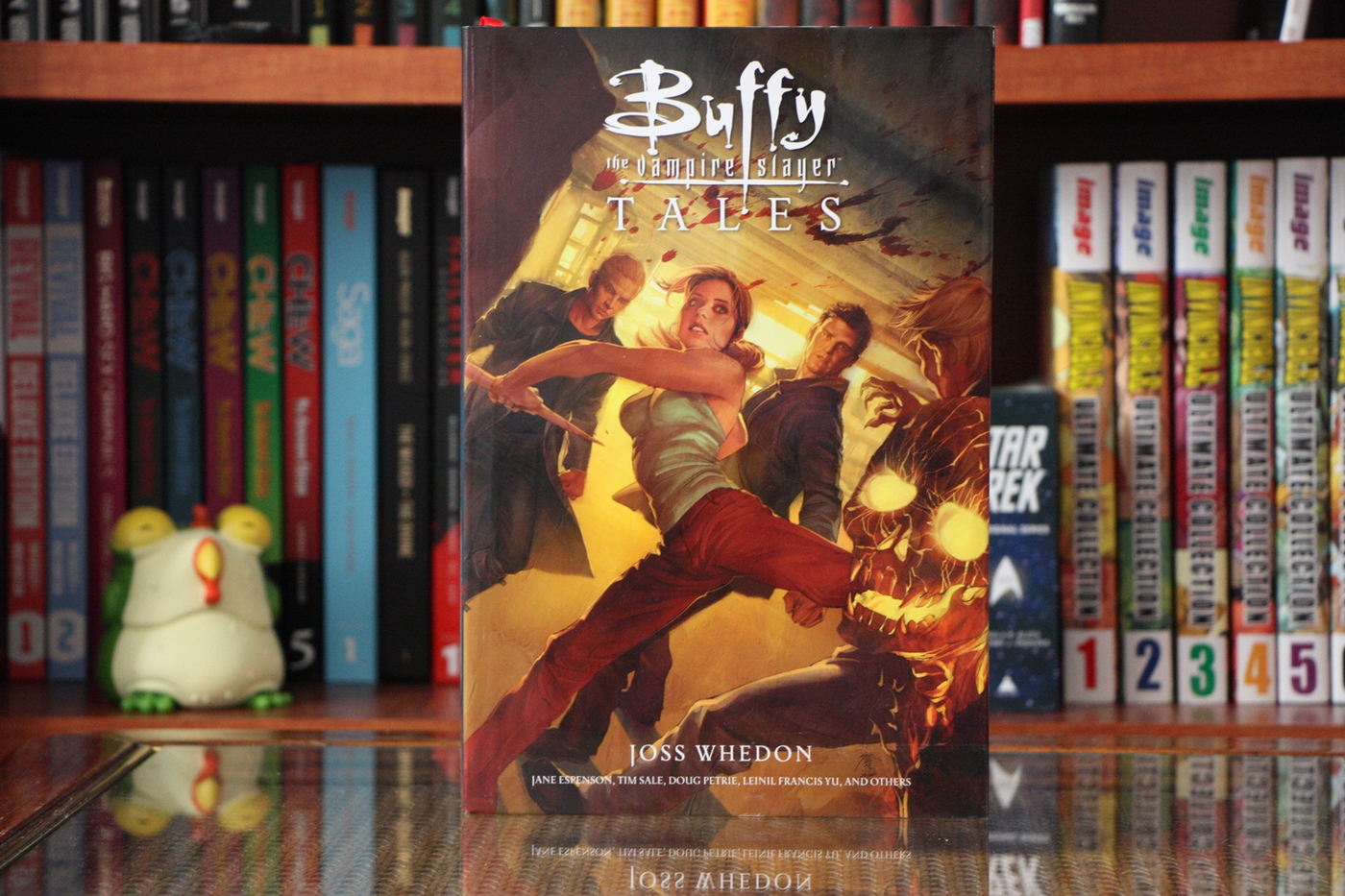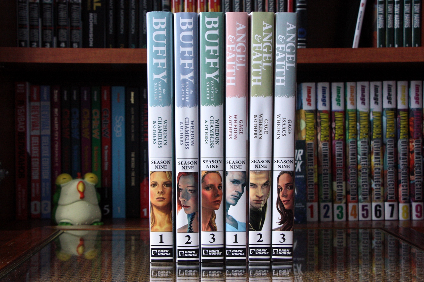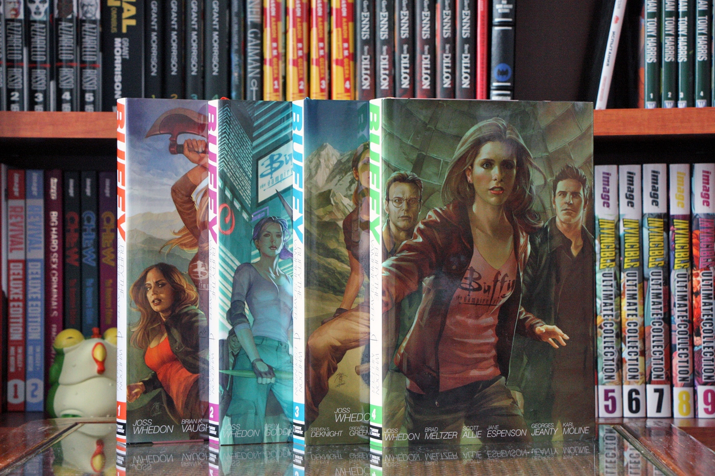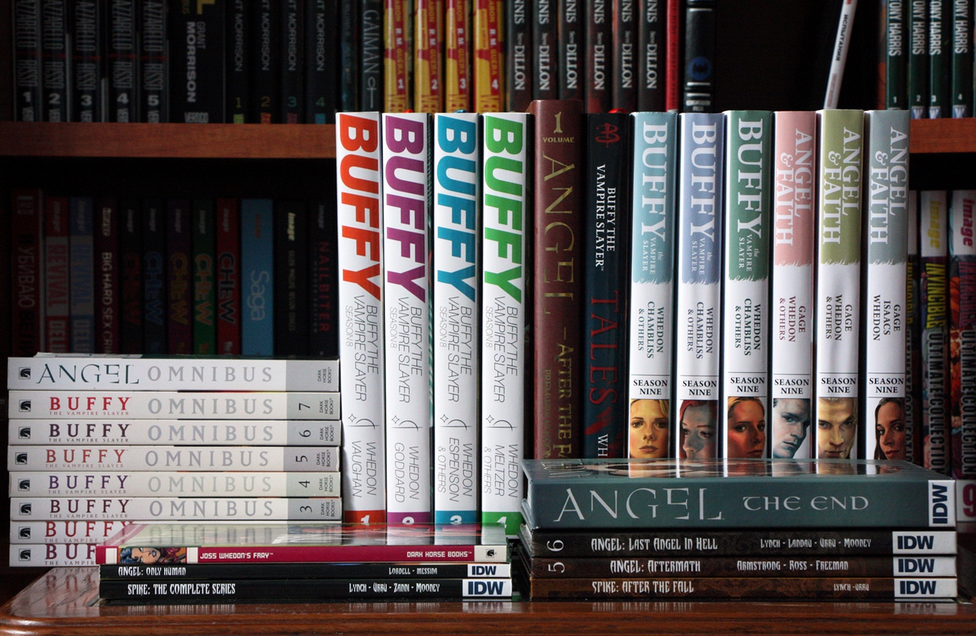 На днях я опубликовал лонгрид-долгострой по вселенной Buffyverse. Все что я хотел сказать о франшизе, вы найдете в той статье, а сегодня я покажу вам все комиксы по Buffyverse в моей коллекции. “Buffy the Vampire Slayer Season 8” Library Edition Начну с железно канонных вещей. 8 сезон Баффи издавался 4 Library хардкаверами от Dark Horse Comics. Особенно мне нравится внешнее оформление. Снаружи вы можете лицезреть основные обложки комикса, нарисованные Джо Чен спереди и фрагменты рисунков основного художника Жоржа Жанти с аннотацией к тому сзади. Кстати, для этих изданий, как и для 8-ми трейдов 8 сезона Баффи, Чен специально рисовала новые обложки, хотя, по моему мнению, рисует она в пропорции 50/50 с половиной обложек сделанных по высшему классу, тогда как вторая половина просто омерзительна. Виной тому то, что рисует Джо по большей части с актеров сериала, но не всегда толково. Под суперобложкой оформители поступили довольно интересно. Корешки у них одинаковые и без какой-либо индексации томов или сезона. Передняя обложка, что называется, “доставляет”. Спереди изображены портреты ключевых персонажей по одному лицу на том. Мне особенно нравится этот элемент, поскольку Жанти, на мой взгляд лучше прочих художников передает эмоции и характер персонажей, и, несмотря на то, что тиснение с монотонной обложкой я люблю больше подобного оформления, здесь это выглядит очень подходяще. Сзади же представлены случайные альтернативные обложки того же Жоржа Жанти, и вот тут-то выбор мог быть куда интереснее. Как заведено у Dark Horse Comics, – качество изданий выше всяких похвал, и это при каверпрайсе в 29,99$! Крепкий прошитый (+клей) переплет и ляссе – все, как положено столь шикарным изданиям. Впрочем оформление и внутри комикса стабильно отличное. Особенно радует начало номеров с вводной панели посреди темной страницы, в переизданиях не теряющее эффектности. Еще одним неоспоримым достоинством этих изданий является наличие большой бонус-секции в виде альтернативных обложек, обложек трейдов и скетчей. В среднем в каждом томе бонусы занимают от 30 до 40 страниц. На фото ниже я отделил количество страниц бонусов (+ реклама и послесловие) для наглядности. “Buffy the Vampire Slayer Season 9” Library Edition Переходим к 9 сезону. Если вы читали путеводитель по Buffyverse, то вероятно помните, что в рамках 9 сезона выходили сразу 2 серии: титульная серия Баффи и второй онгоинг Angel & Faith. Всего вышло по 3 хардкавера каждой серии. Стоит оговориться, что поскольку каждая серия насчитывала по 25 номеров, а подобные издания включают в себя, как правило, 10 выпусков, то количество номеров на 1 том не бьется. На помощь Library изадниям приходят 2 мини-серии “Willow: Wonderland” и “Spike: A Dark Place”, включенные во вторые тома BtVS season 9 и Angel & Faith соответственно. Вышло эргономично и логично.. Интересно, как поступят с 10 сезоном, где выпуски не бьются так ровно. Оформление суперобложек еще лучше 8 сезона. Стив Моррис невероятно хорош. Под суперобложками оформление подобно 8 сезону: Собственно и с бонусами тут все выдержано в тех же пропорциях и содержании. “Angel & Faith” Library Edition Angel & Faith не отстает на всех фронтах, поэтому выкладываю фотографии книг скопом: “Buffy the Vampire Slayer Tales” Hardcover Далее я расскажу о более интересном и оригинальном издании – Buffy the VampireSlayer: Tales HC. Я считаю, что данная книга заслуживает отдельного шелфпорна, но раз уж я посвятил Баффи спецвыпуск, проще будет рассказ